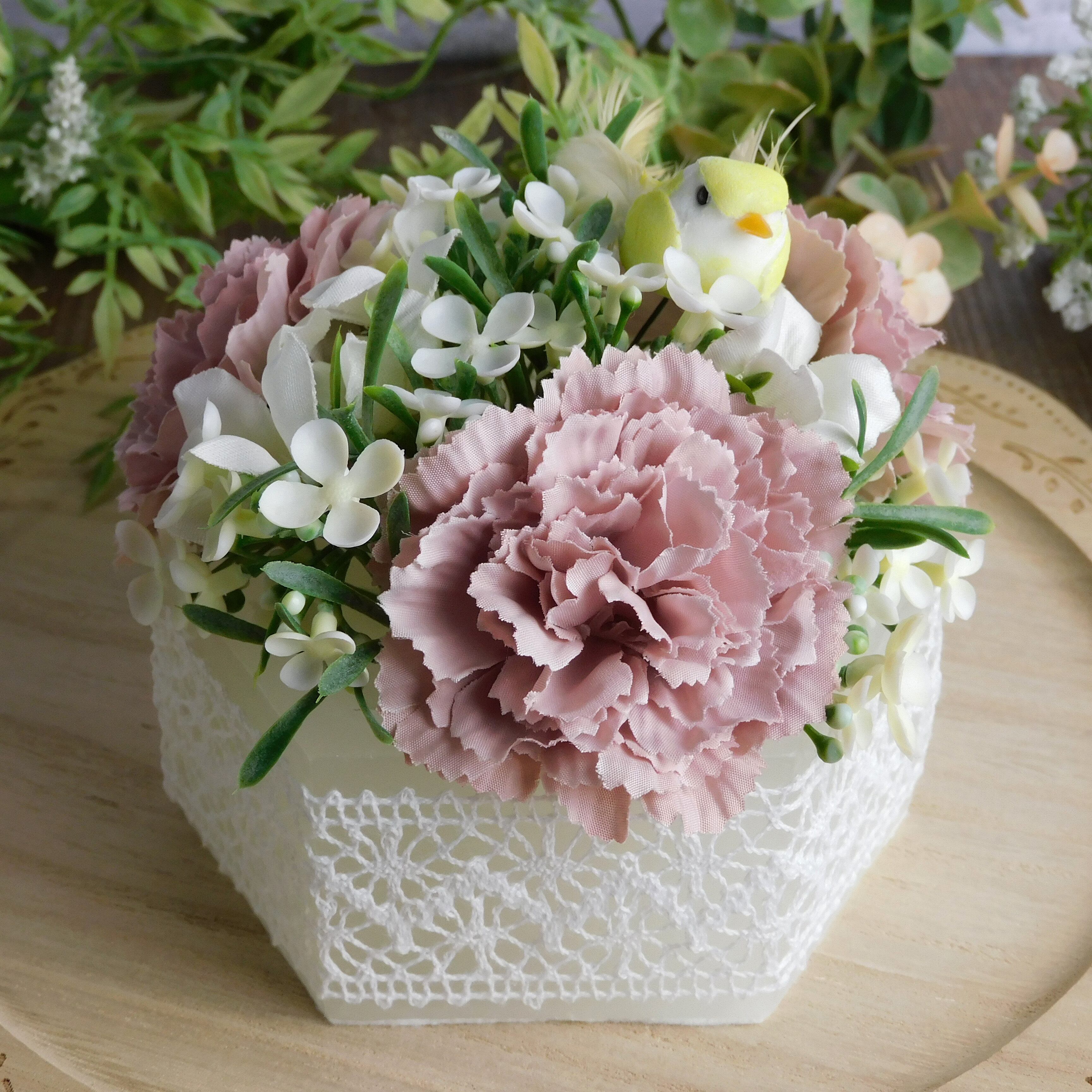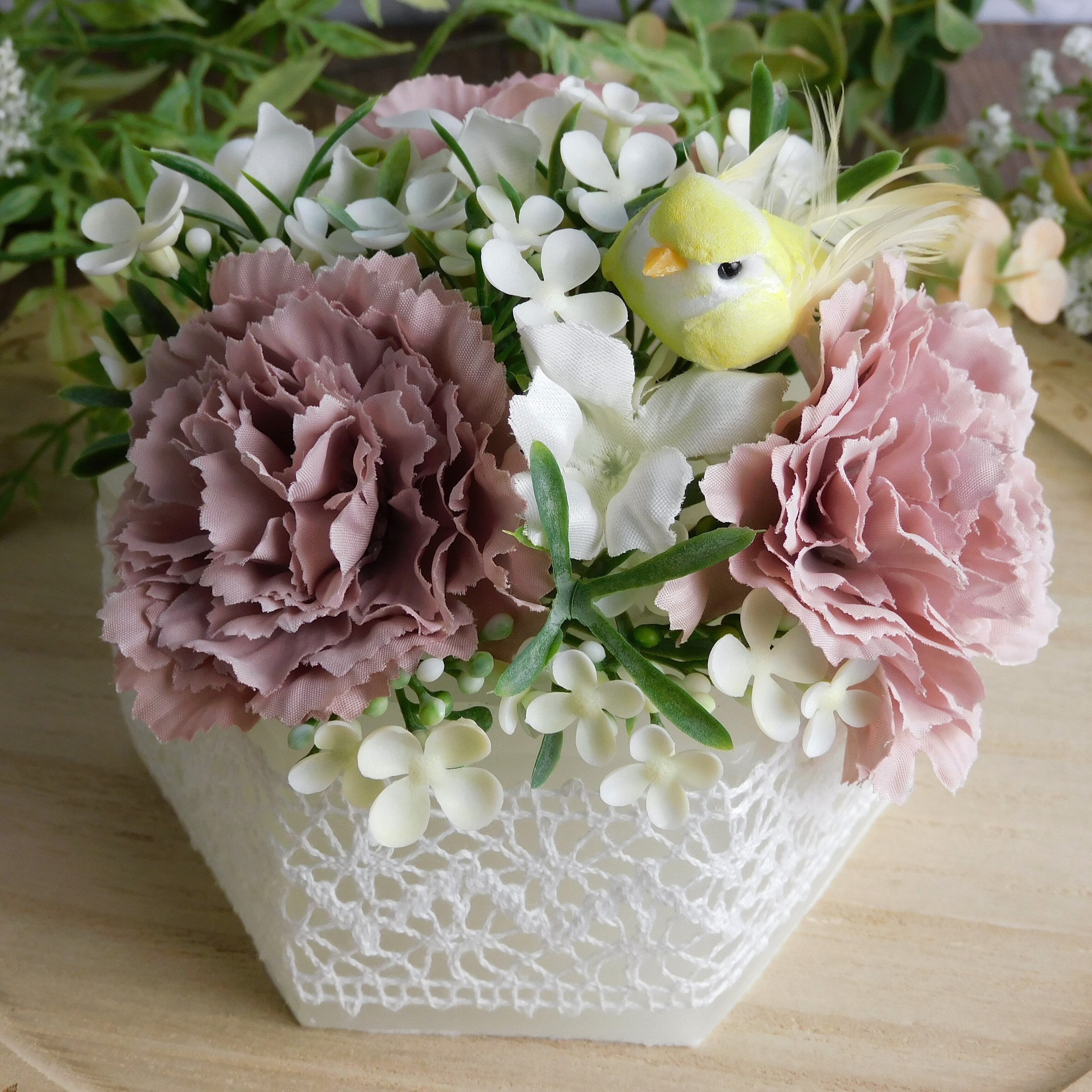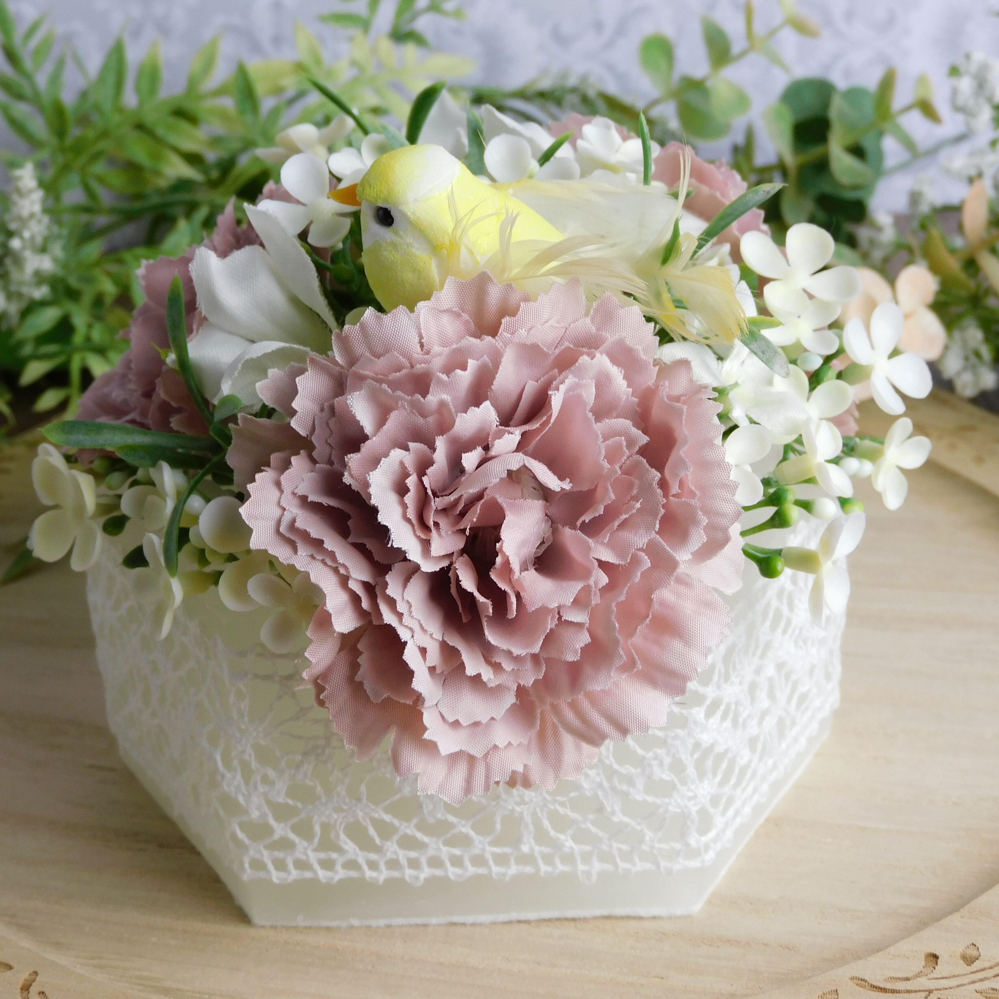 可愛らしいカーネーションに小さな小鳥を添えてアレンジしたルームライトです。